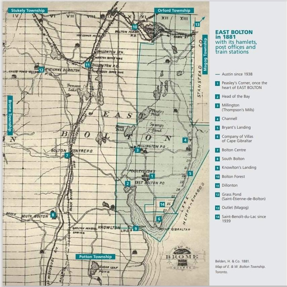 Les hameaux de cette partie du canton furent Millington (fondé par Thompson), Peasley’s Corner, Head of the Bay et Knowlton Landing. Seul Peasley et Knowlton Landing subsistent. Peasley s’est appelé East Bolton (lorsque West Bolton devint une municipalité dinstincte), puis est devenu le village d’Austin après la création de la municipalité d’Austin. Au même moment, toutefois, Saint-Benoît-du-lac, un vaste domaine à peu près à l’endroit où Nicholas Austin s’était établit, devint aussi une municipalité distincte.